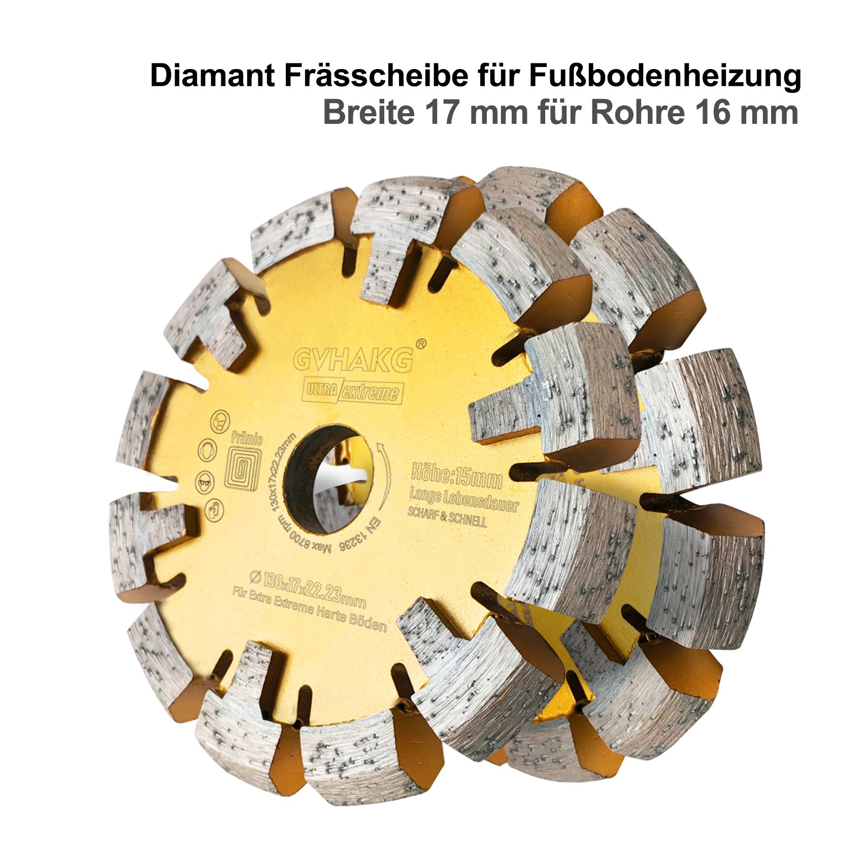 The GVHAKG Diamond Milling Disc (130 x 17 x 15 x 22.23mm) is a premium dry-cutting blade designed for heavy-duty scarifying and grooving. Its robust construction and specialized U-segments make it perfect for creating clean, dimensionally accurate channels for 16mm underfloor heating pipes in the toughest materials.